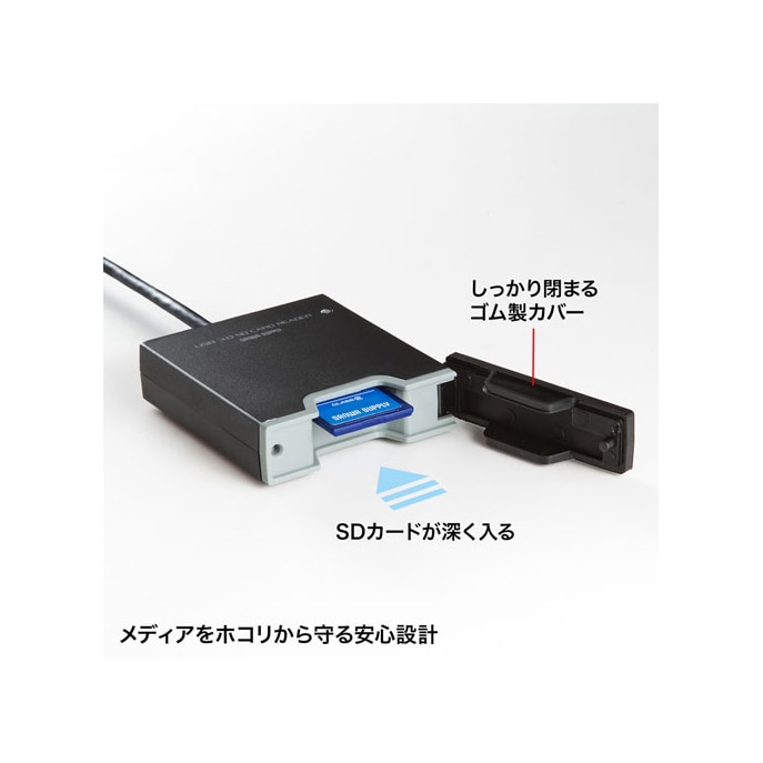 ・大切なメディアをホコリから守る、ゴムカバー付きカードリーダーです。・メディアを挿入したまま蓋ができます。