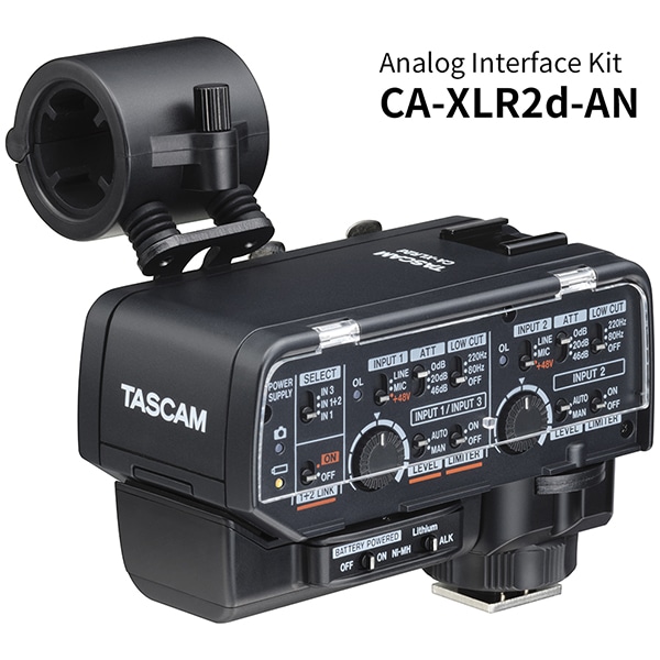 CA-XLR2d-AN マイクホルダー (本体装着済み)、電池ボックス、3.5mm (1/8") ステレオミニケーブル、TASCAM ID登録ガイド、スタートガイド (保証書付き)、CA-AK1-AN コールドシューマウントアダプター (本体装着済み)
