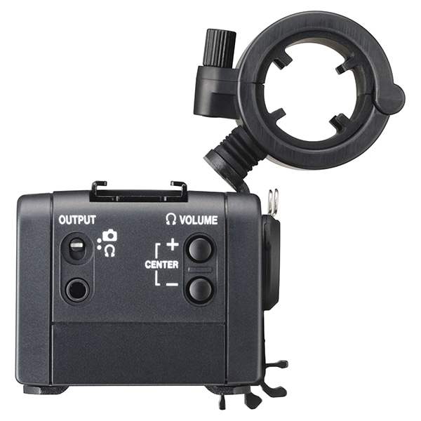 また、振動ノイズに配慮したショックマウント機構付きマイクホルダー(本体から取り外し可能)と天面に配置されたコールドシューにより多様なマイク接続を実現します。