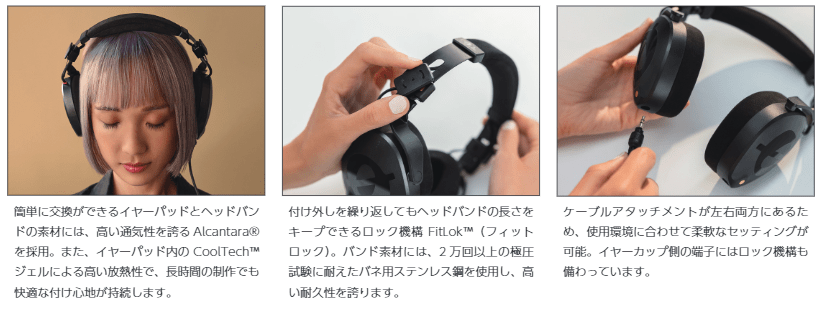 交換可能なイヤーパッドとヘッドバンドには通気性・耐久性に優れた高級人工皮革 Alcantara®(アルカンターラ)を使用。