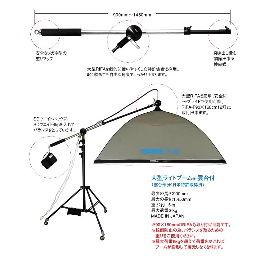大型RIFAを簡単・安全にトップライトで使用可能。 特許雲台使用。軽く締めても自由な角度でしっかり止まります。