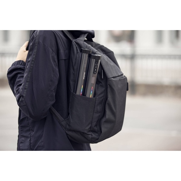 TL30、1つの重さはスマートフォン2台程度。細長いチューブ形状はかさばらずスマートに収まります。スタジオはもちろん、ロケーションや旅行においても、このポータブルライトを使用するとこれまでにない解放的な体験ができます。多彩なエフェクトモード