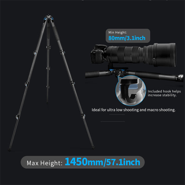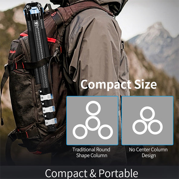 8層カーボンファイバー素材を使用し軽量かつ頑丈なつくり。センターコラムがない設計でコンパクトかつスムーズな撮影が可能な三脚です。
