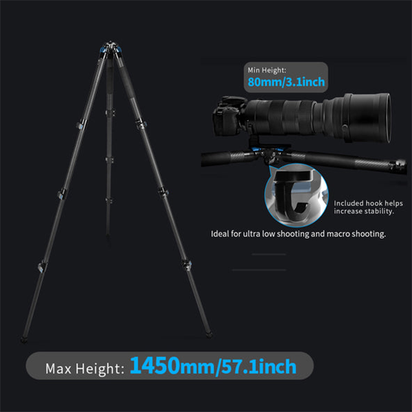 8層カーボンファイバー素材を使用し軽量かつ頑丈なつくり。センターコラムがない設計でコンパクトかつスムーズな撮影が可能な三脚です。