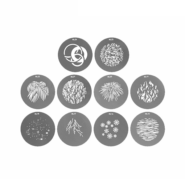 NANLITE AS-GB-FMM-SET2 はForza 60/60B/150 用FMマウントプロジェクションアタッチメントマウントに使用できる GOBOディスク10枚セットです。