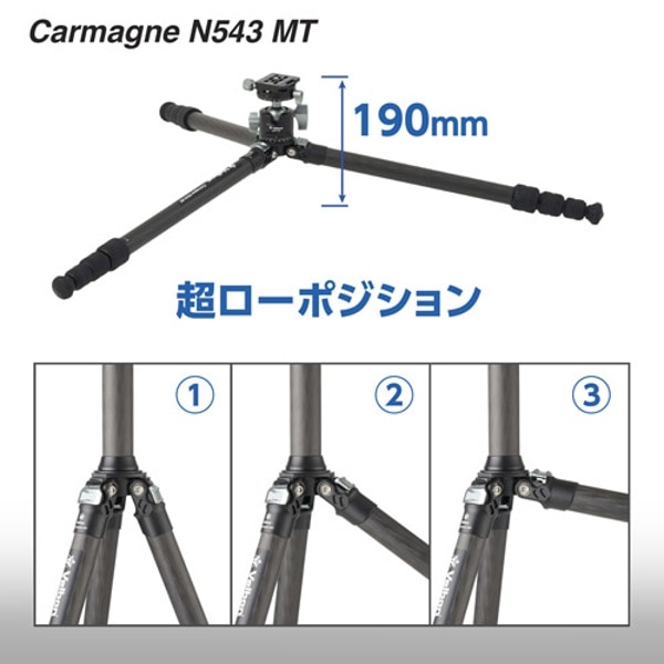 開脚は3段階で調整可能。エレベーターレス構造により、最低高は約19cmと超ローポジション撮影が可能です。高強度10層カーボンファイバーパイプ