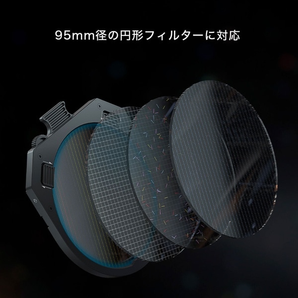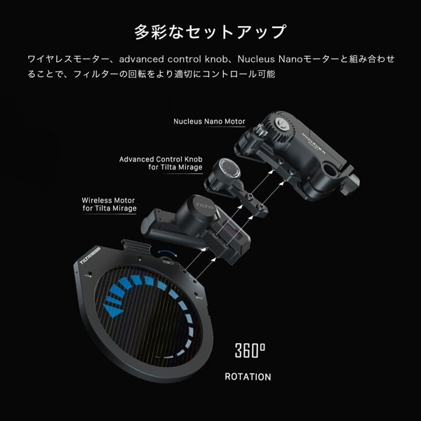 このTilta Mirage用の回転式サーキュラーフィルタートレイは、95mmのサーキュラーフィルターを回転式モジュールと同じように回転させることができます。95mm径の円形フィルターに対応しています。 これは、反射光を制限し、水やガラスなどの反射面による不要なグレアを防止することにより、色の正確性を向上させる95mm Polarizing Filter ( https://Tilta.shop/items/61bc1b173475ed344497742c )の角度を微調整するための解決策となります。 また、フィルタートレイは、95mm Streak Filter ( https://Tilta.shop/items/61bc2d444adba03a48a4efdd )などのエフェクトフィルターの水平を調整するのにも最適です。 フィルター上部の調整ギアは手で回すことができますが、アドバンスド Control Knob ( https://Tilta.shop/items/61cf312b47a534625c6ab0b1 )を使って、より快適で正確な調整をすることもできます。 このフィルタートレイは、Nucleus NanoモーターとNano Motor Adapter ( https://Tilta.shop/items/614d678f8c1a5b0be53ffe24 )、またはTilta Mirage用ワイヤレスモーター ( https://Tilta.shop/items/614d62bcedf49f70592d678b )を使用してワイヤレスでコントロールすることもできます。【同梱品】