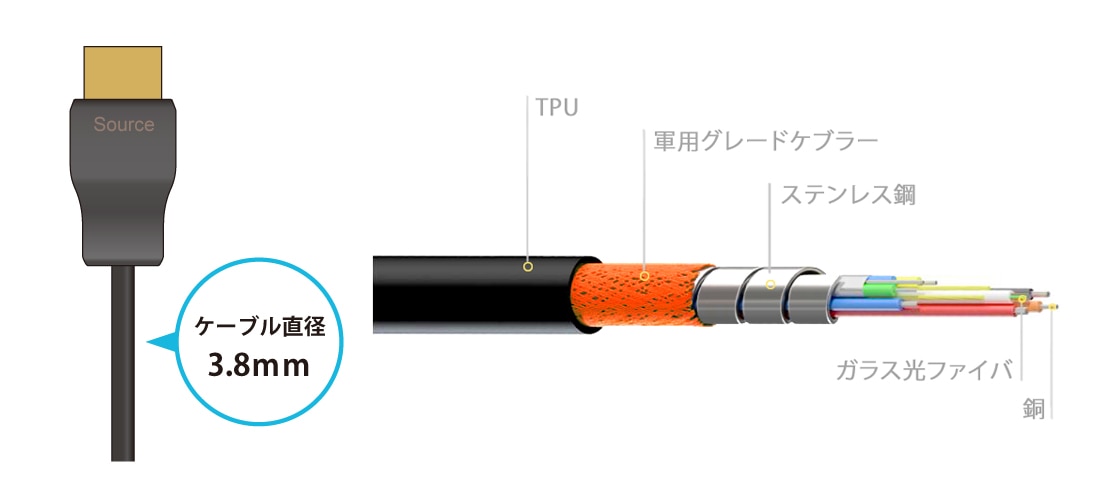 本製品は、ステンレスとケブラー®が被覆された高強度ガラス光ファイバケーブルを採用したウルトラスリム アクティブHDMIケーブルです。市場最細クラスの直径3.8mm超極細ケーブルを採用。※1) 細いながらもケーブル被覆は3層構造になっており、螺旋構造のステンレス鋼、防弾チョッキにも使われる軍用グレードケブラー®、柔軟で伸びが良いTPUの順番に光ファイバと銅線を覆っております。この独自構造により最大2000N (204kgf)の圧力に耐えられる優れた圧壊強度と、最大800N (81kgf)の高い引張強度を実現しました。ケーブルが踏まれたり、引っ張られたりしてしまうことの多い現場や設備などでも信号・機能を損なわずに維持します。※2)信号伝送には損失が極めて少ないOM3規格の光ファイバと、その他の信号線に銅線を使用したハイブリット構成を採用。ロスの少ない光ファイバにより最大4K UHD@60 4:4:4 (最大伝送帯域18Gbps)信号を外部給電なしでの長距離伝送を実現しました。※3)
