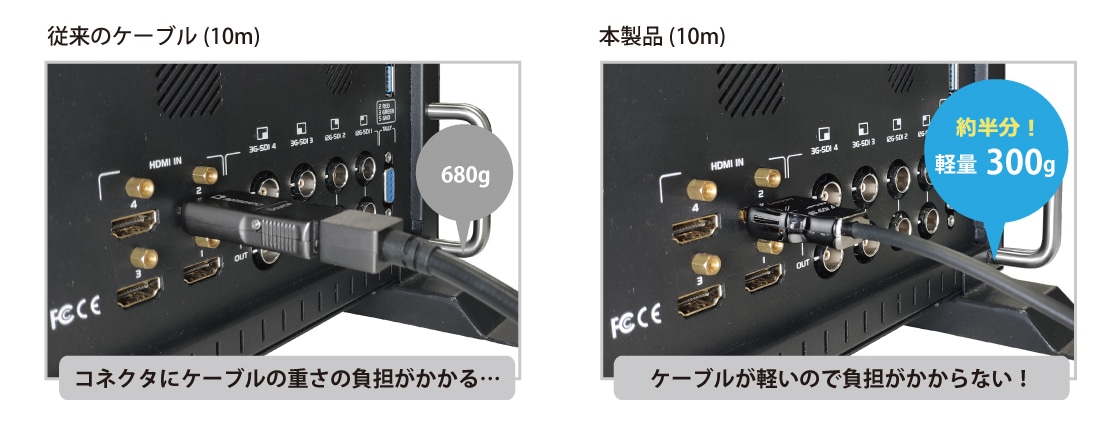 同じ長さのパッシブケーブルや従来のアクティブケーブル(10m約680g)と比較しても軽量(10m約300g)な本製品は、持ち運びしやすく、かつ柔らかなケーブル(最小許容曲げ半径38mm)なので、設置時のシンク機器側コネクタへの負担が少なく済みます。※1)
