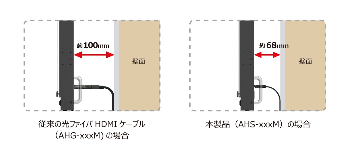 また、コネクタ部分は奥行きわずか30mmの超コンパクト設計。従来のアクティブケーブルからは考えられない程小さく、壁際設置された機器への利用にも最適です。
