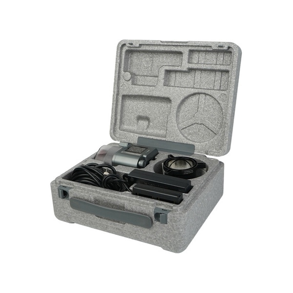 本体背面の液晶に、出力や設定値などが分かりやすく表示されます。出力調整用のノブは1%単位で調光可能、またノブを押し込むことでプリセットされた出力値にセットすることができます。キャリングケース