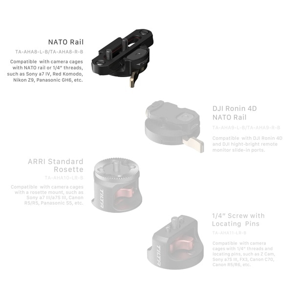 Tiltaing アドバンスド Side Wooden Handle用アタッチメント。 Tiltaing アドバンスド Side Wooden Handleの左側に装着可能。 NATOレールを介して多くのケージに接続可能なユニバーサルデザイン。 1/1/4"-20ネジでハンドルを取り付けるための36mm NATOレールアタッチメントが付属しており、ほとんどのケージに適合させることも可能です。 ※本製品はアタッチメントのみでサイドハンドルは含まれません。