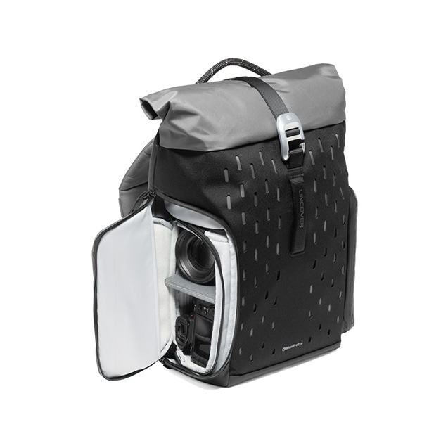 メインの収納部はジッパー式の SmartLift システムで上下に分割できるため、例えば下部にカメラインサート、上部には身の回り品、といった分類収納が可能です。カメラインサートにはバッグ側面のジッパーからサイドアクセスも可能なため、バッグを地面に下ろすことなく素早くカメラを出し入れすることができます。