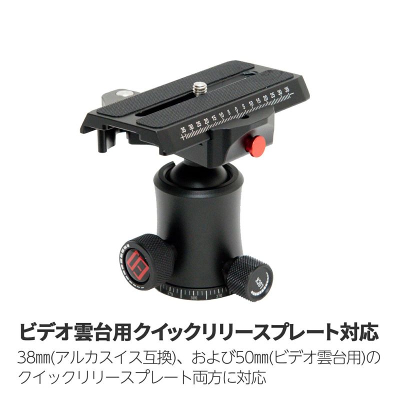 ・アルカスイス互換、ビデオ雲台用クイックリリースプレート両対応38mm(アルカスイス互換)、及び50mm(ビデオ雲台用)のクイックリリースプレートに対応。