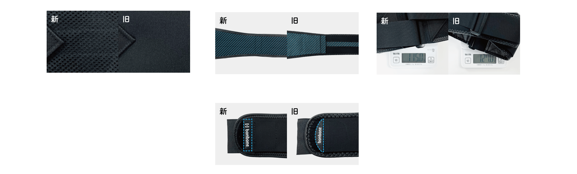 約15gの軽量化!着けていることを忘れそうな軽やかさです。また、全体的に薄くなり外観に響きにくくなりました。周りの目を気にせず腰をサポートします。※写真はフリーサイズの比較です。