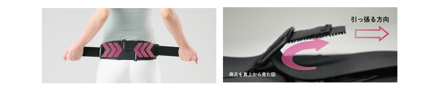 ベルトを軽く左右に"シュッ"と引っ張ることで骨盤が気持ち良い程締まります。