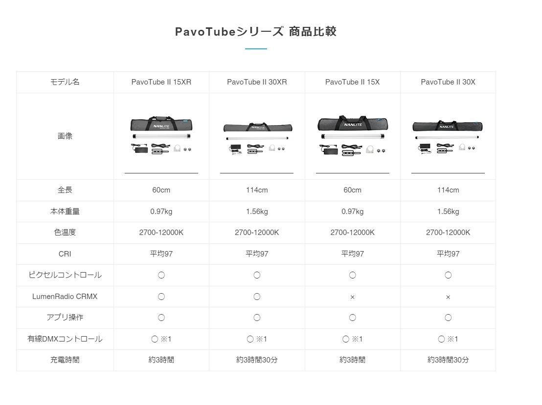 ※1:PavoTube II X、PavoTube II XRのDMXコントロールの際は別売りのDMXアダプターケーブル「CB-DMX-ACP-1/2」が必要となります。