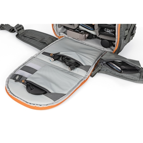 バッグ全体の丈夫な構造とDuraflexのフックにより重量のあるスキー板やスノーボード、三脚を取り付けることが可能。豊富な収納力
