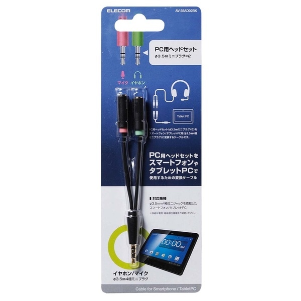 3.5mmミニプラグx2(マイク入力端子・イヤホン端子)を搭載したヘッドセットを、スマートフォンやタブレットPCのΦ3.5mm4極ミニプラグに接続できる変換ケーブルです。