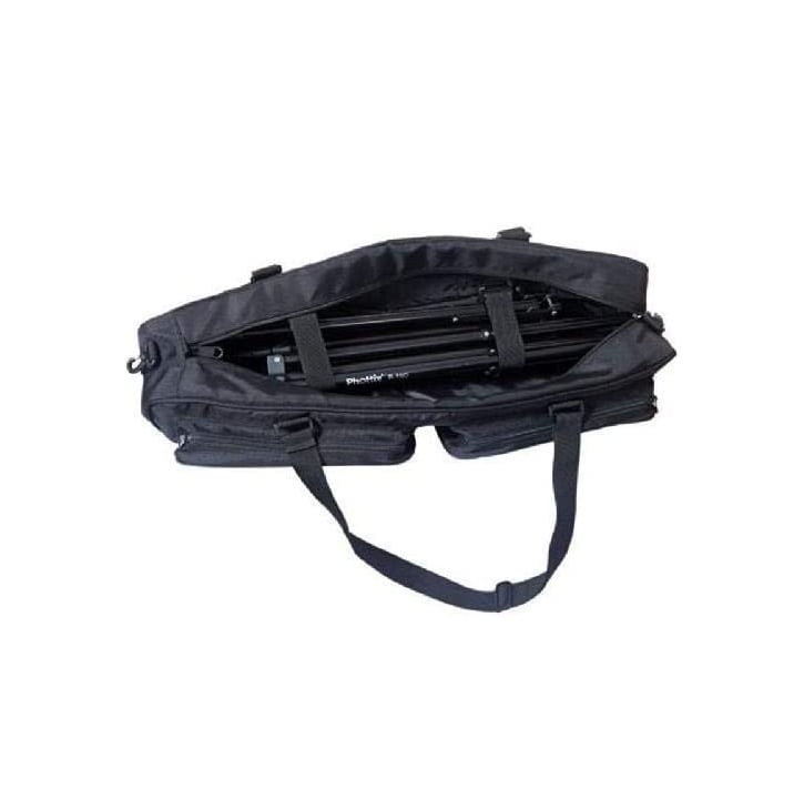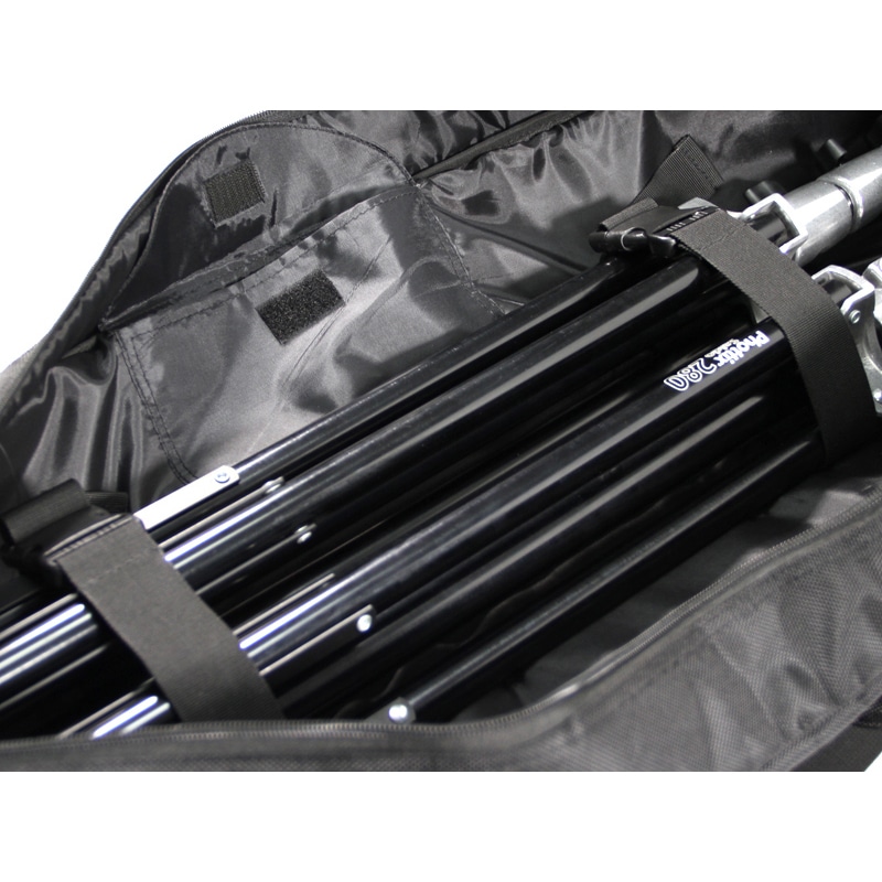 縮長900以下のライトスタンドや三脚、アンブレラなどの機材が収納可能。内部には長さ調節が可能な機材固定ベルトを2ヶ所装備。ポケットが外部に2ヶ所と内部に1ヶ所あり、ストロボ等のアクセサリー収納に使用できます。長さ調節可能なハンドストラップと取り外し可能なショルダーストラップが付属しており、持ち運びも便利に行えます。
