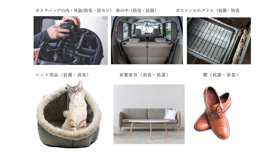 布や革などを用いた家具製品・バッグ・車の中・ペット用品・靴・などの抗菌・消臭・防カビ※ペット用品などに使用する場合は本品の成分が対象動物に有害でないか予めお調べ頂いてから使用してください。