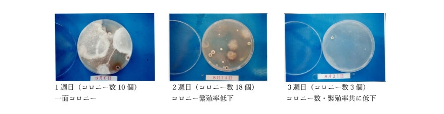 食品工場発酵室内の落下菌の生息調査(天然わさびオイルを庫内に設置し1週間毎の落下菌を4日培養したもの)