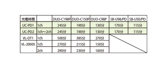 1チャンネルあたり最大で65WまでのUSB PD充電が可能なUC-PD1、UC-PD2を使えば高速での充電が可能です。SB-U50/PDの場合はPD 30Wで充電し約115分、SB-U98/PDの場合はPD 45Wで充電し約170分で完了します。
