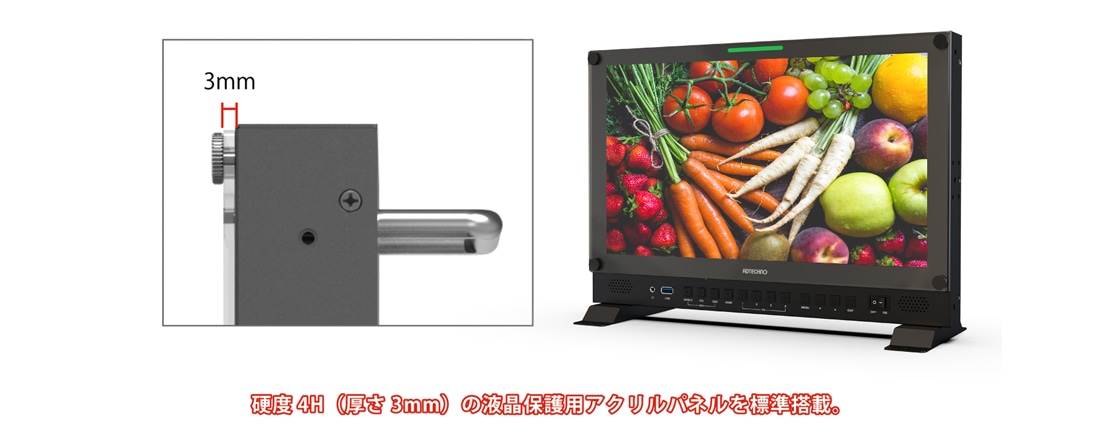 硬度4H(厚さ3mm)の液晶保護用アクリルパネルを標準で付属。移動中や現場での不意な液晶パネル破損を防ぎます。※7)