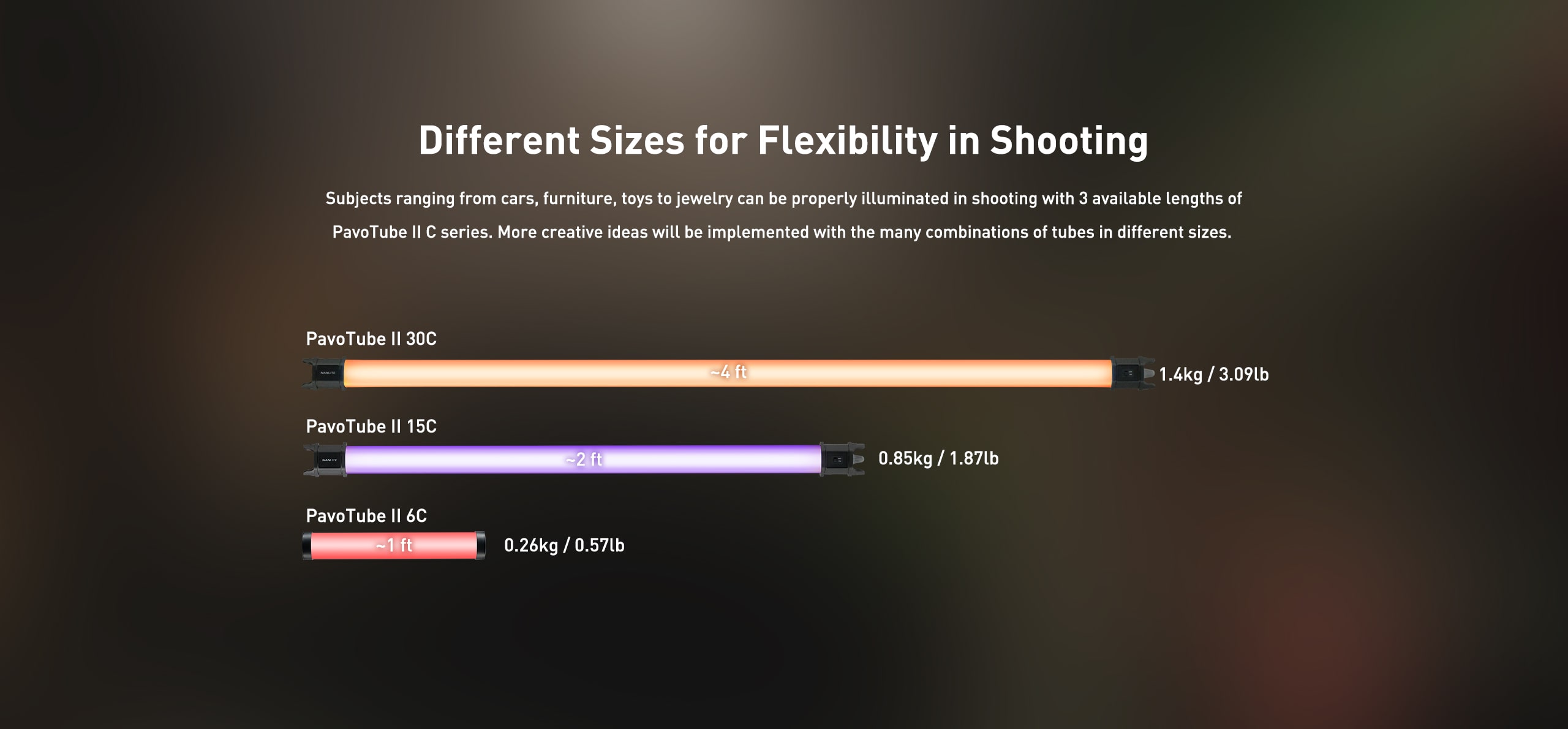 前モデルに比べてPavoTube II 15C/30Cは最大50%ほど輝度が高くなっただけでなく、G/M±150の調節機能が搭載され、LEDチップが見えづらくなり、上質な光を演出。加えて、前モデルに比べて操作フレームが短くなり、ライト本体の照射範囲も広がるなど仕様がパワーアップ。15種の照明モード