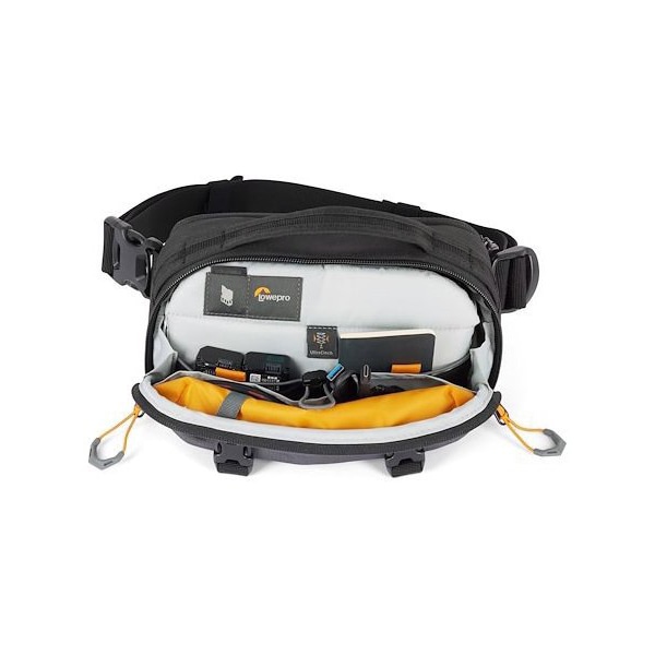ウルトラシンチTMコンプレッションシステムは、この伸縮性のあるストラップを引っ張ることで、内部を包み込み、機材を安定させます。出し入れしやすい様、ジッパーは大きく開き中には複数のポケットを配置し身の回り品も整理可能です。