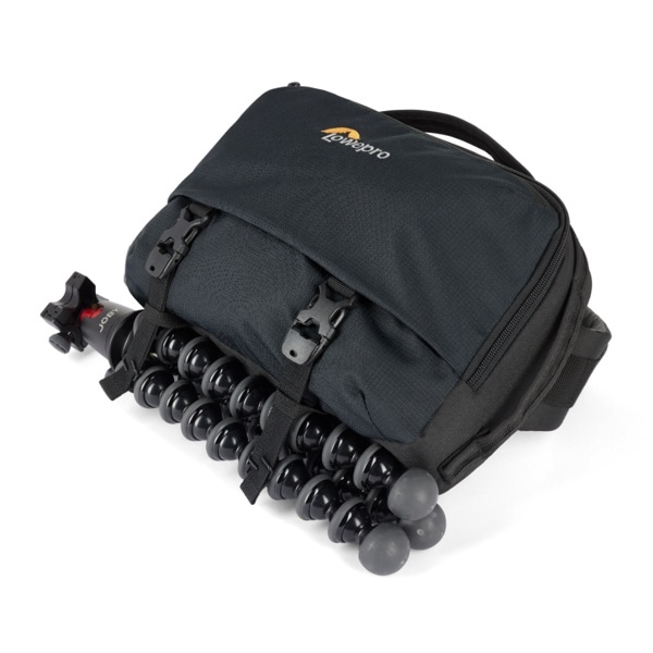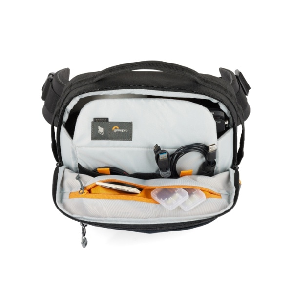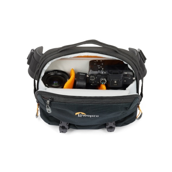 トレッカーライトのバックパックはトップローディング式を採用した収納部分が特徴で、中には身の回り品やカメラ用の GearUp カメラインサートを整理して収納可能です。GearUp カメラインサートは付属のストラップを使用すればショルダーバッグとしても使用が可能です。