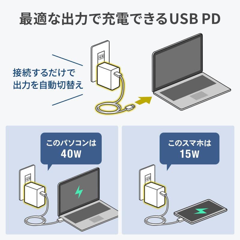 接続機器に合わせて出力電圧を自動で切り替える、USB PD規格による充電が可能です。