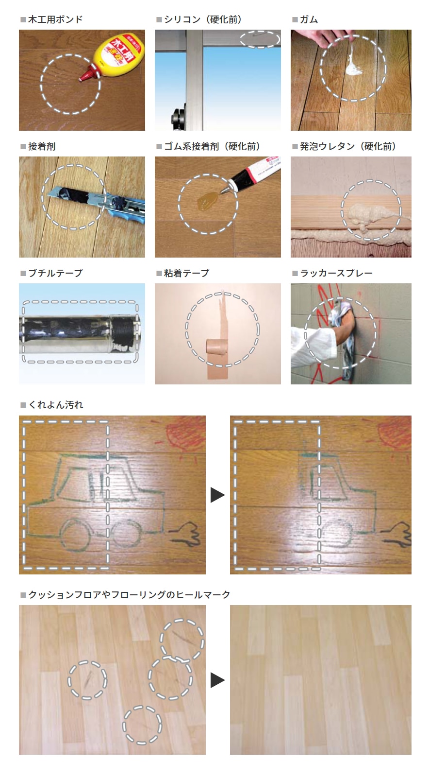 ※溶剤系の汚れは、その成分によってすでに下地が侵されている場合があるので、汚れが落ちても後が残っている場合があります。