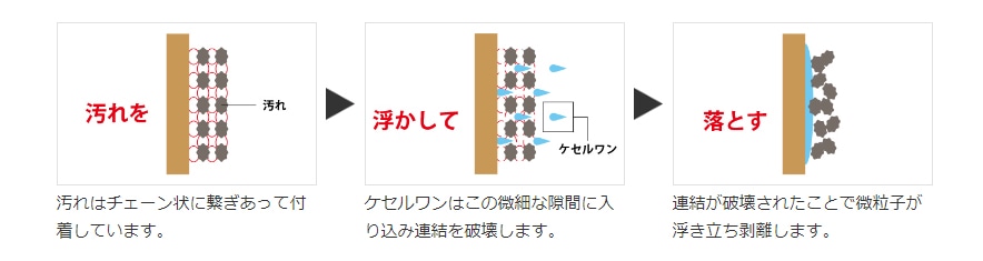 ケセルワンの成分は生分解し、水を加えることで作用を止めることができるため、洗浄効果のコントロールが可能です。さらに生分解するため洗浄水の環境影響は非常に小さくなります。