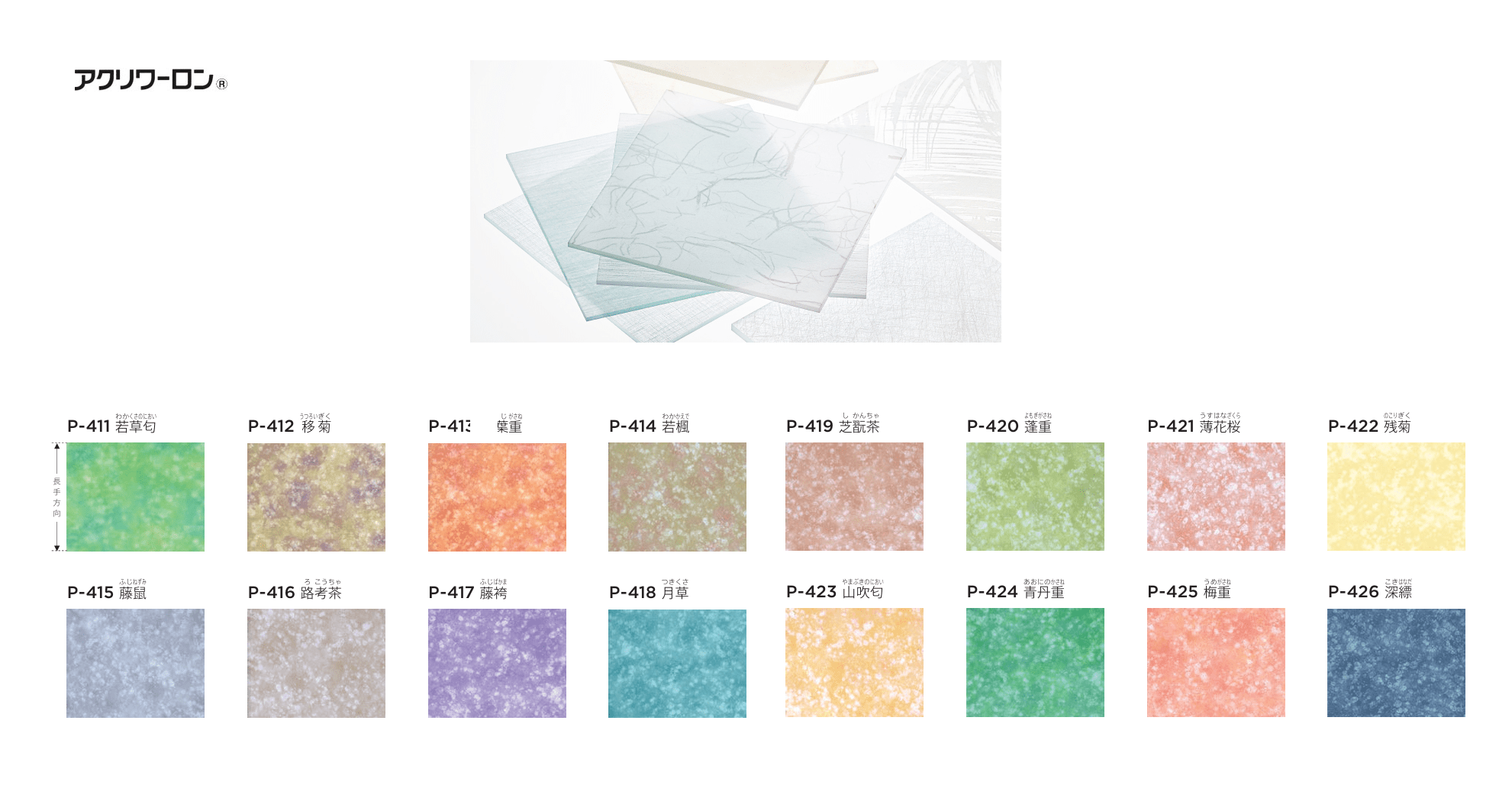 アクリワーロン「ろうけつ染め調シリーズ」は、平安装束の「かさねの色目」を思わせる日本の伝統的な染色技法であるろうけつ染めの趣と色調を多色印刷で表現した色彩感あふれる装飾樹脂板です。全16種に及ぶ「ろうけつ染め調」の豊富なカラーバリエーションや変化に富んだパターンに加え、アクリワーロンならではの成形性で、照明カバー、光壁、パーティションなど和風モダンテイストに満ちた空間演出にお役立てください。