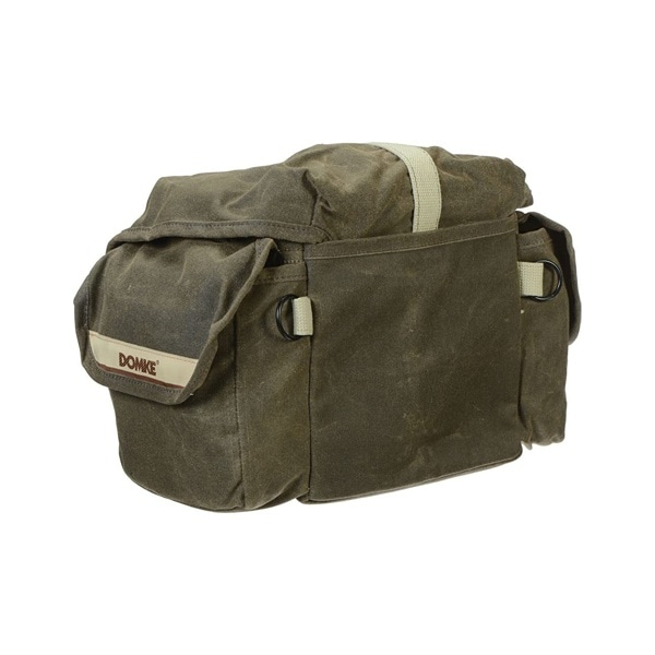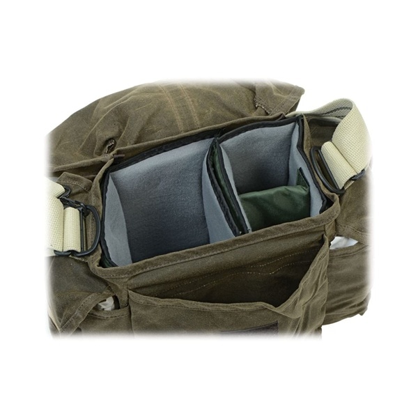 バッグの両サイドと前面、背面にポケットが設けられ、それぞれフィルターやストロボなどのアクセサリーや小物の収納に最適です。前蓋は金具と面ファスナーで留められ、蓋内側にはジッパーポケットがあります。