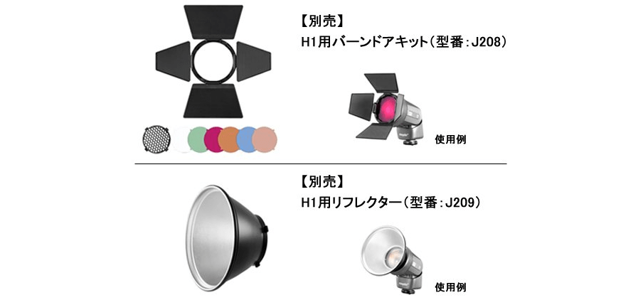 H1用のアクセサリーとして、バーンドアと6種類のカラーフィルター、ハニカムグリッドがセットになったH1用バーンドアキット(型番:J208)と、前面に被せて使えるナイロン製ディフューザー付きのH1用リフレクター(型番:209)をご用意しています。どちらも4つの爪でしっかりとH1本体に固定することができ、併用することで光の表現の幅がより広がります。