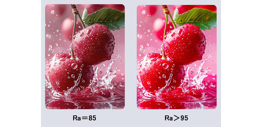 平均演色評価数(Ra)は95以上、テレビ照明一貫性指数(TLCI)も97以上と、演色性にも大変優れています。