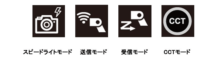 使用時は、単体のフラッシュとしてオンカメラで使う「スピードライトモード」、ワイヤレストリガーとしての機能も兼ねつつ発光可能な「送信モード」、受信機としてオフカメラで発光させる「受信モード」、定常光として使う「CCTモード」の4つのモードから1つを選択します。