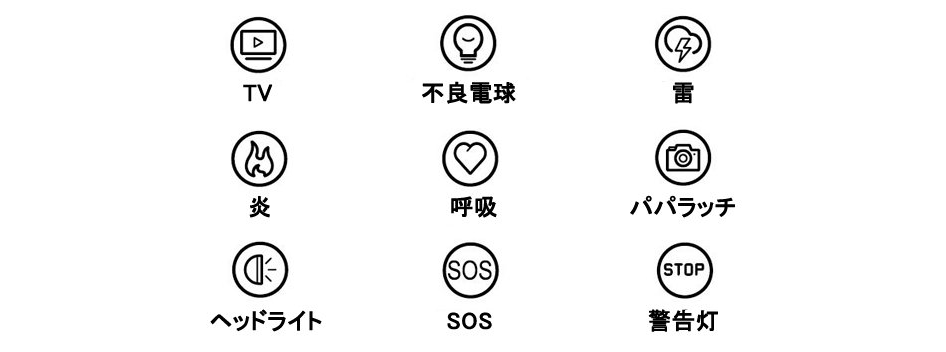 | 特殊照明モード | 9種類(TV/不良電球/雷/炎/呼吸/パパラッチ/ヘッドライト/SOS/警告灯) |