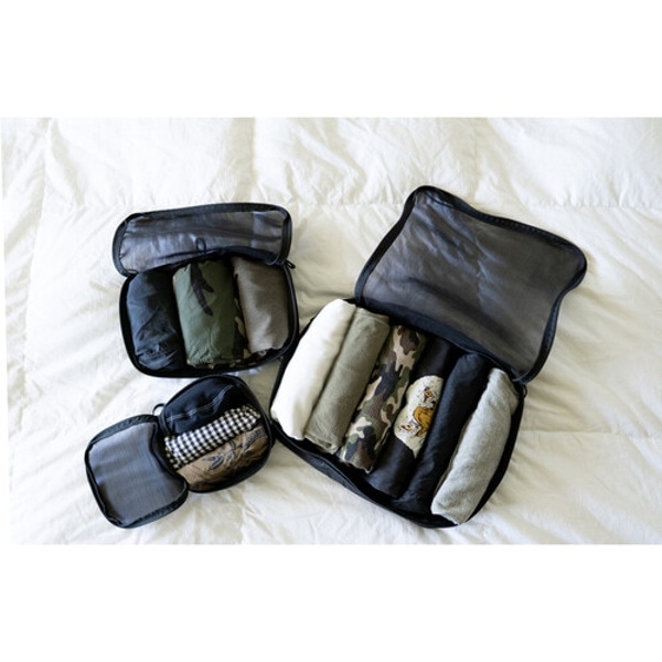 ラージ、ミディアム、スモールの3サイズ展開で、衣類や小物の収納に最適なポーチです。