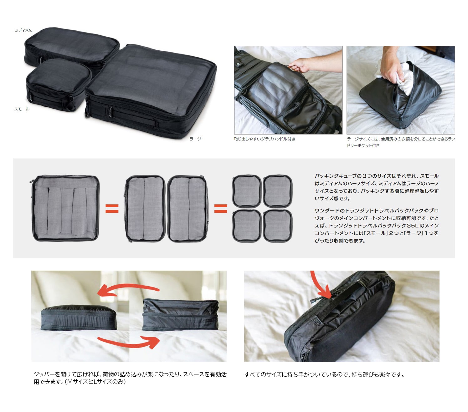 ラージサイズとミディアムサイズには、容量を拡張できるジッパーがついています。