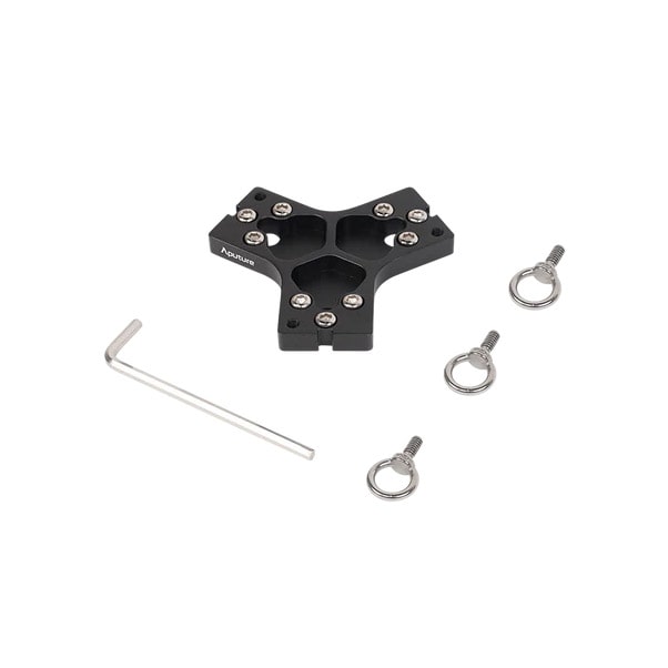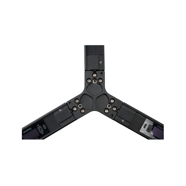 3 灯の INFINIBAR を 120 度に分岐することができるコネクターです。コネクター本体は DC 駆動で通電することはできませんが、INFINIBAR の両端にあるメス受け 5.5mm DC バレルケーブルに接続ができる切り込みがあり、DC 駆動することができます。1/4-20 インチのネジ山があり、付属の吊り下げリングで灯体を吊り下げることができます。