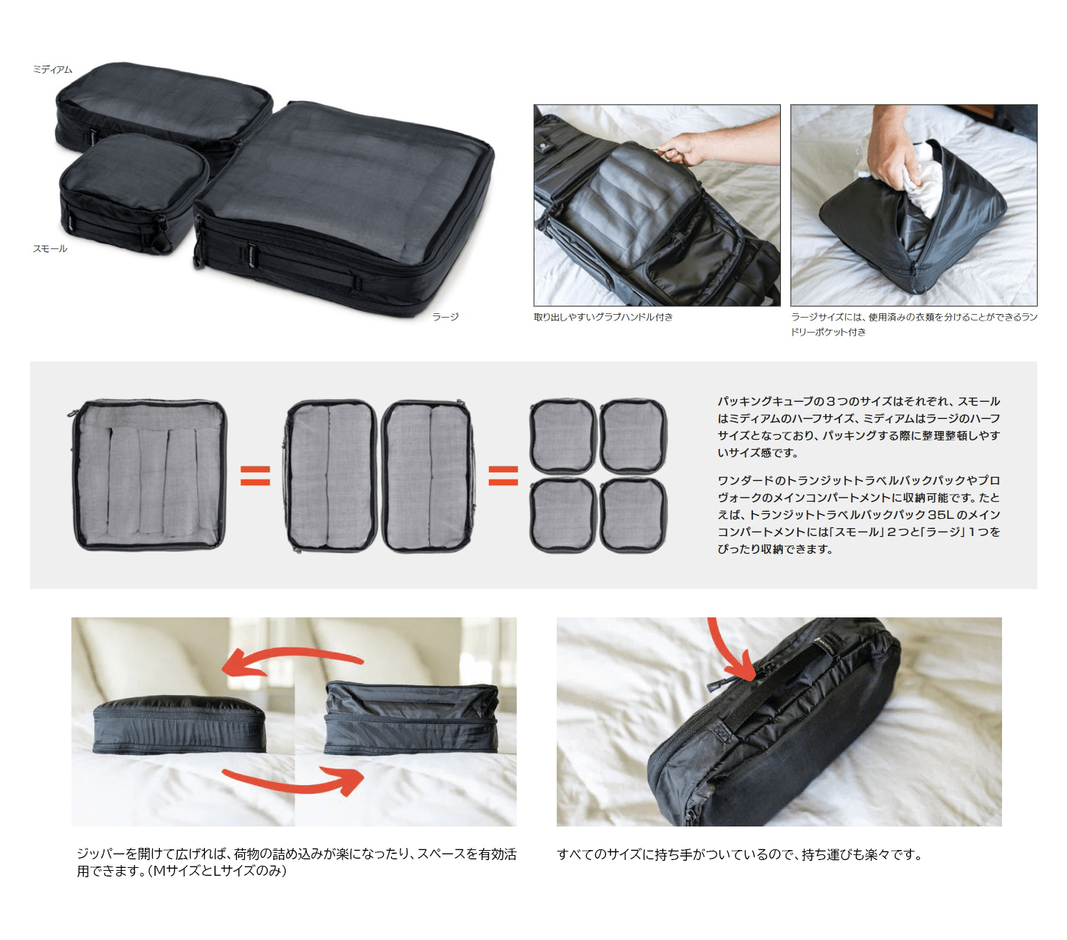 ラージサイズとミディアムサイズには、容量を拡張できるジッパーがついています。