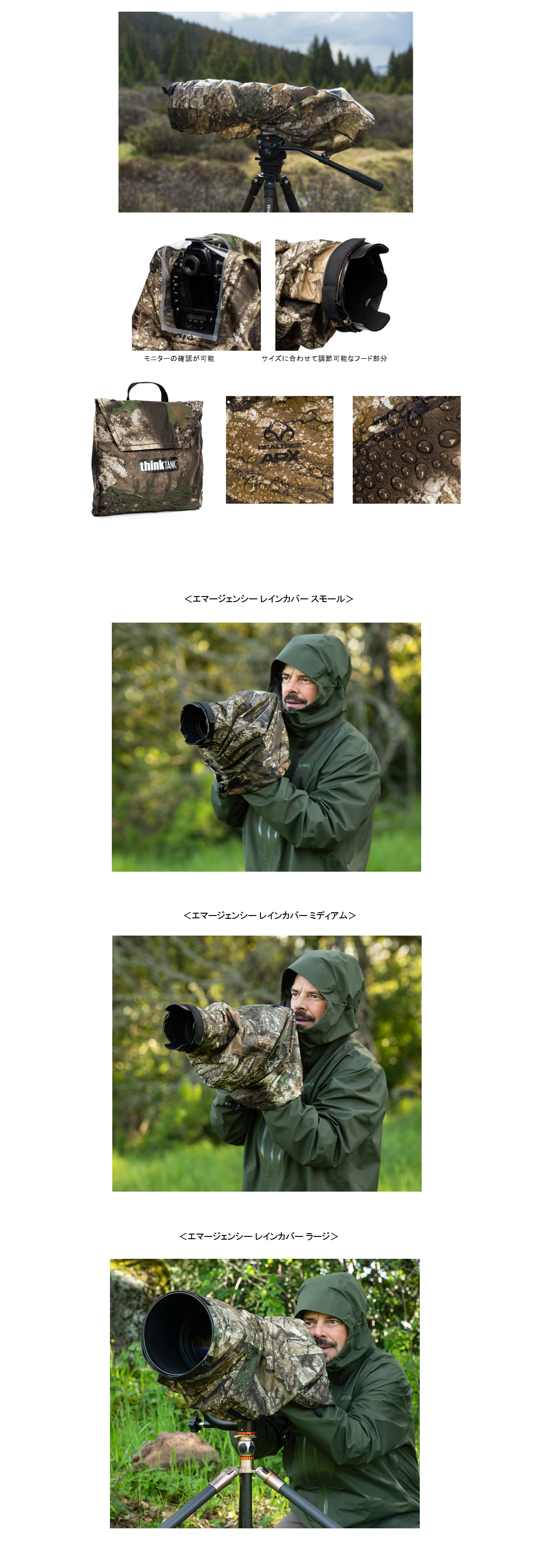 大雨やほこりの多い場所での撮影時に大切なカメラとレンズを守る、コンパクトなレインカバーです。