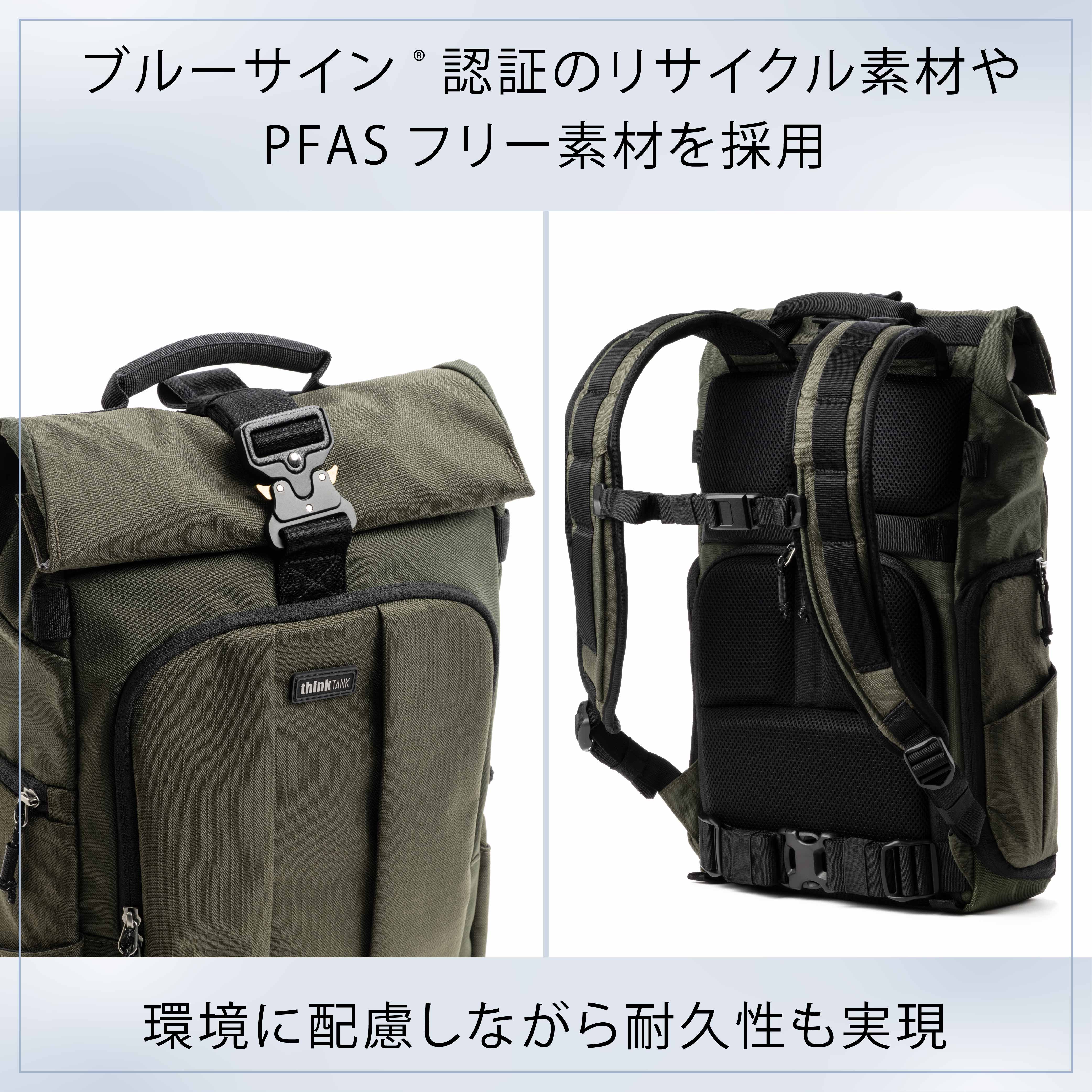 バッグにはBluesign®認証を受けたリサイクル素材やPFASフリー素材を採用。サステナブルでありながら高い耐久性を持ち、安心して使用できます。また、メインコンパートメントには信頼性の高いYKK® RC Fuseジッパーを使い、優れた耐候性を誇ります。