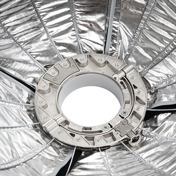 さらに、フラットかつコンパクトに折りたたんで収納・持ち運びが可能な設計を採用しています。硬い点光源を柔らかく拡散し、被写体を包み込むような自然で美しい光を実現します。また、深いパラボリックデザインが均一な光の分布を実現し、高反射シルバー内面により光出力を最大化。