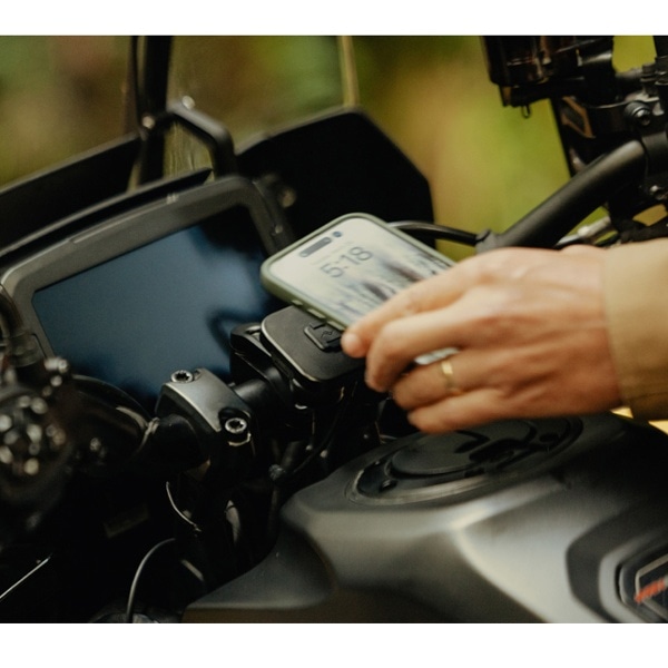 本体は耐水性に優れた頑丈なアルミ製で、ヘッド部分の独自機構によりスマートフォンの揺れや振動を防止します。SlimLink™のハードロックによりしっかりとスマートフォンを固定し、取り外す際にはヘッド部分のプッシュボタンで簡単にロックを解除できます。バイク用グローブを装着した状態でも、スマートフォンの着脱が可能です。