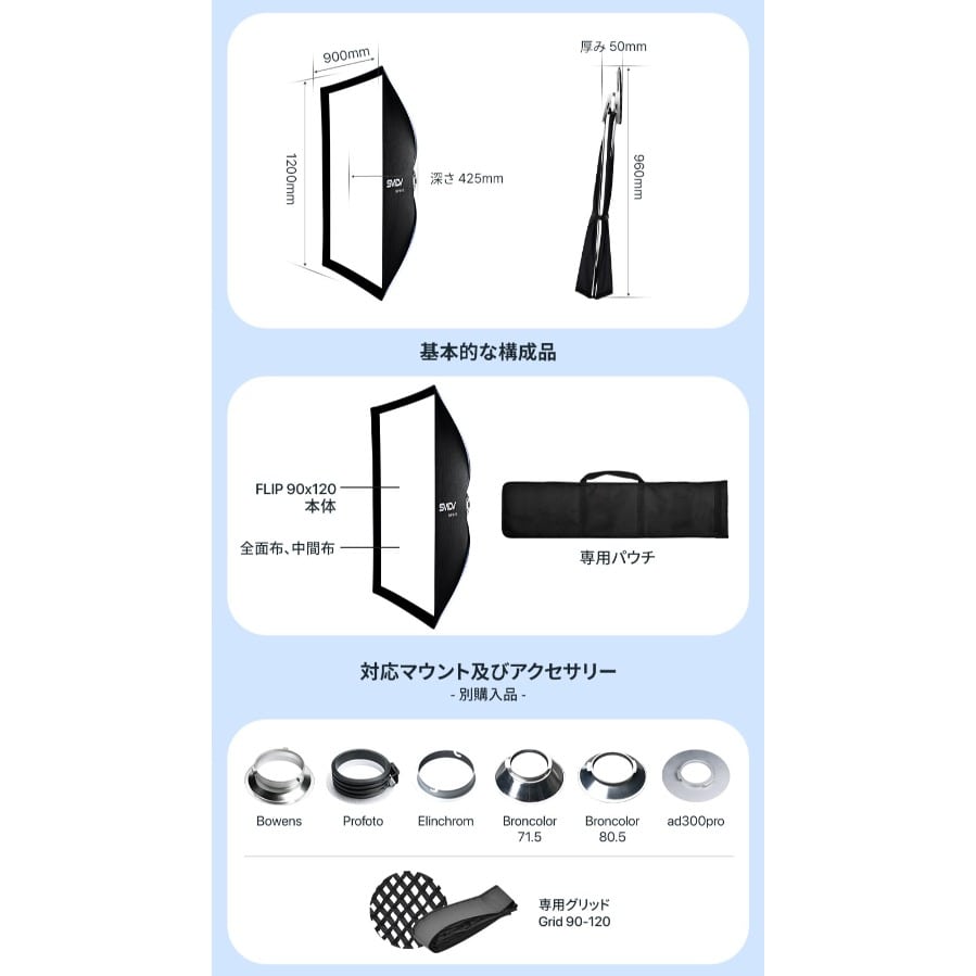 Flip Nemo は、Speedbox-Flip Gシリーズと同様に瞬間的なセットアップ機能を持ち、Bowens, Broncolor, Ellinchrome, Profoto, AD300Proマウントに対応。
