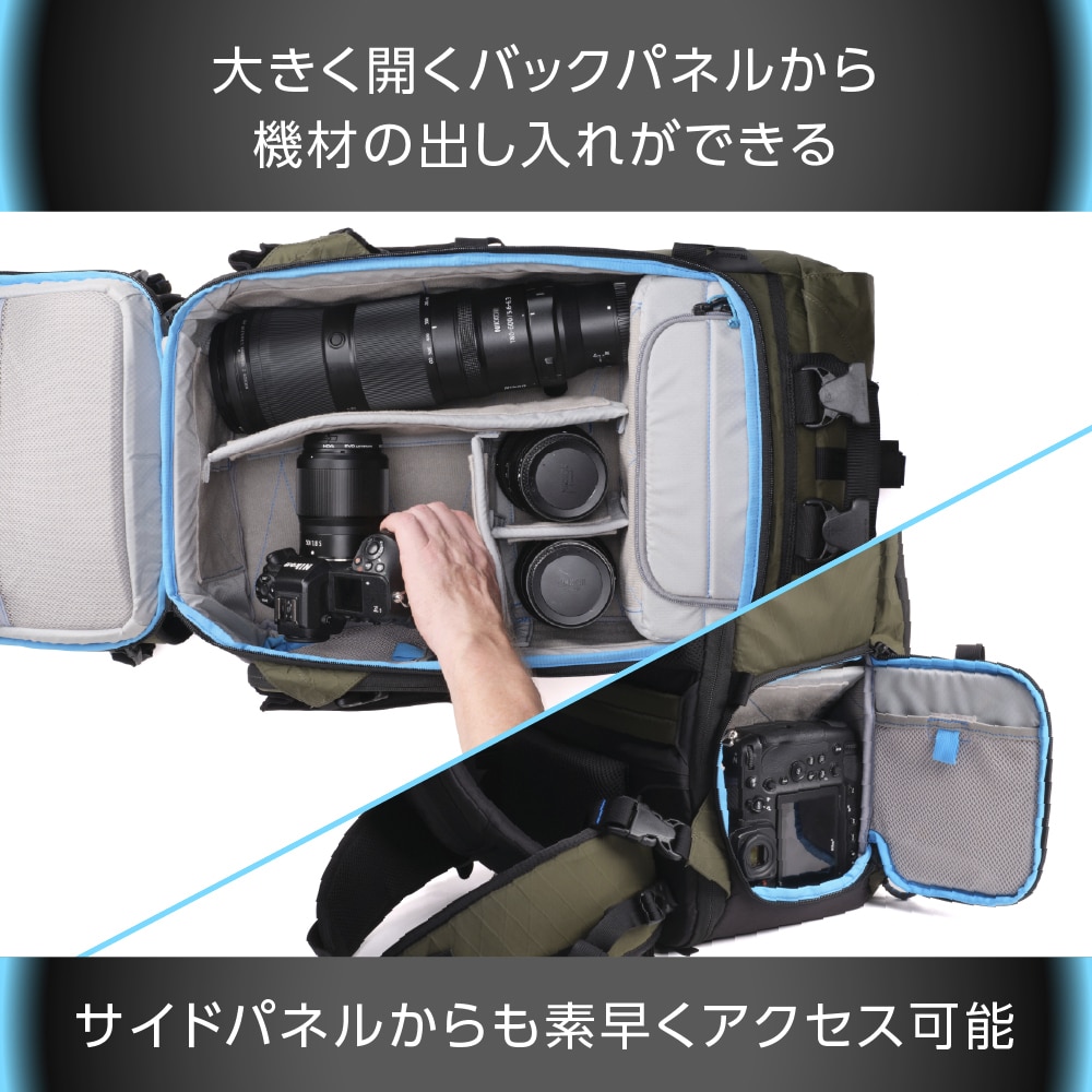 バッグを下ろさずに中身が取り出せるように、バッグの片側にジッパーで開閉できるサイドパネルを設けています。パネルの内側にはレンズキャップ等の収納にぴったりなメッシュポケットがあり、細かいアイテムの収納に役立ちます。サイドにはマグネットで開閉できるポケットが付いており、小型三脚やウォーターボトルの収納に便利です。また、三脚上部を固定するためのベルトがバッグに備えられています。